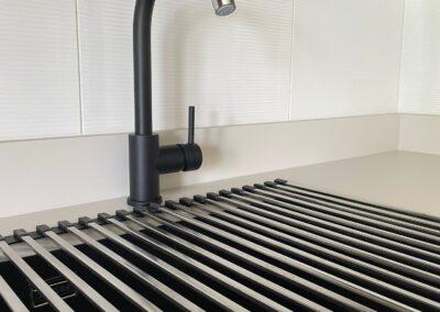 Cocina en blanco mate y roble, tirador lineal «GOLA» negro y encimera en «NEOLITH» JUST WHITE SILK, electrodomésticos Whirpool cristal negro, lavadora integrada, ocultamos termo de agua en la parte alta, también sin cambiar azulejos. Campana decorativa ELICA en cristal negro